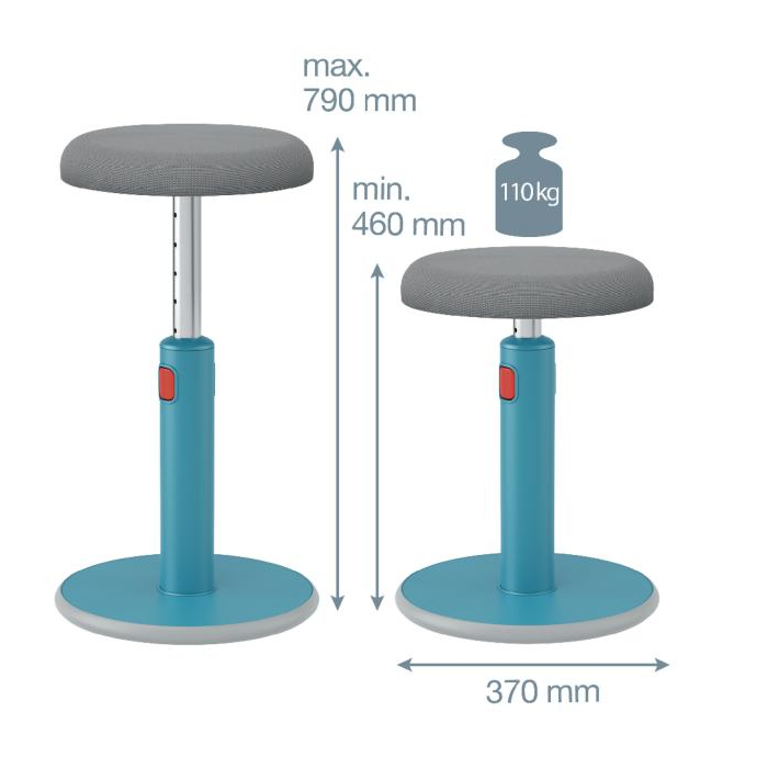 Ergonomická stolička Leitz Ergo umožňuje flexibilný pohyb medzi sedením a státím pri práci, podporuje pohyb svalov, zlepšuje držanie tela a zvyšuje hladinu energie. Má zaoblenú základňu, ktorá podporuje aktívny pohyb otáčaním a hojdaním. Pri práci zároveň posilňujete chrbtové svaly. Výšku možno ľahko nastaviť v rozmedzí 46-79 cm, stolička zostáva pevná a stabilná v akejkoľvek výške. Stolička je pohodlná a praktická, má sedadlo z priedušnej 3D peny potiahnuté vzdušnou sieťovinou protišmykovú základňu, ktorá nepoškodí podlahu. Maximálna nosnosť: 110 kg. Farba modrá.
