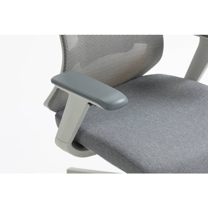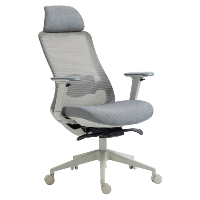 • ergonomická otočná kancelárska stolička s vysokým sieťovaným operadlom, látkovým čalúneným sedákom, opierkou hlavy a podrúčkami