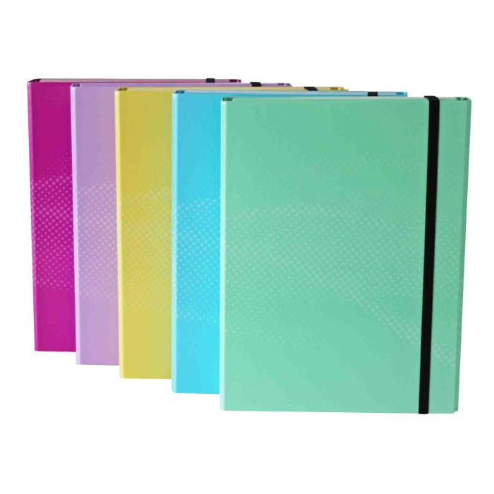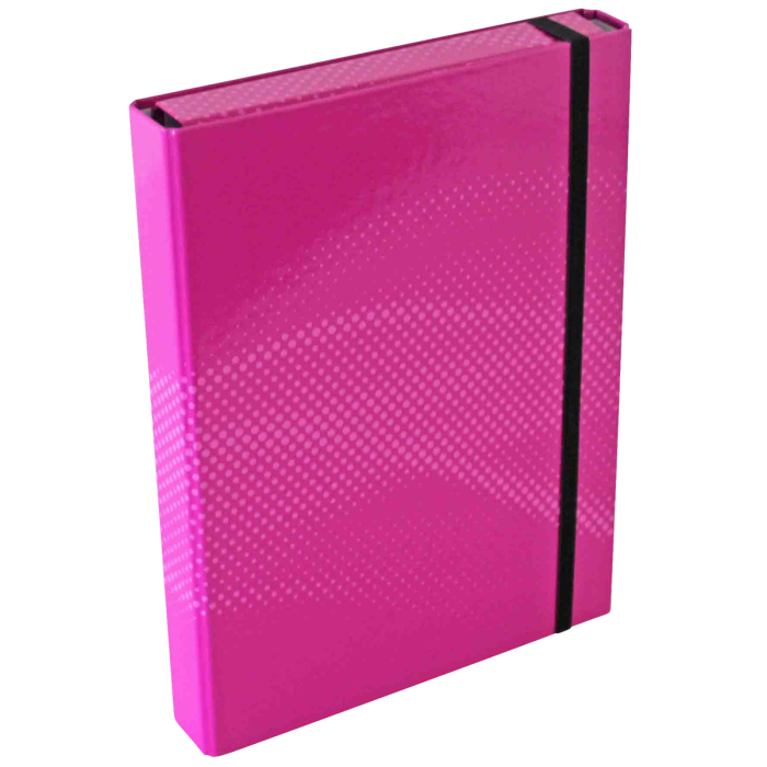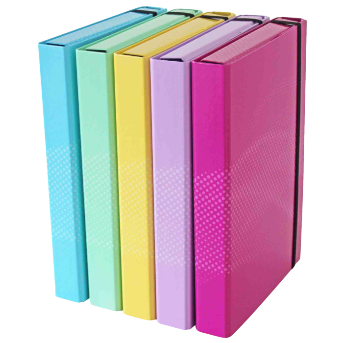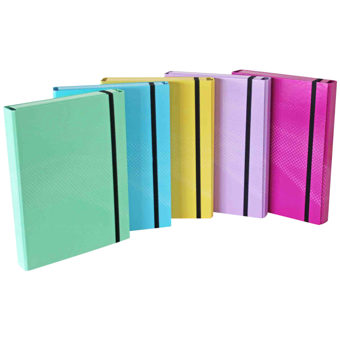 Kartónový box s gumičkou A4, rôznofarebný v 5 pastelových farbách, kartón s papierovou lamináciou, s 8 mm širokým, plochým elastickým uzáverom, 3 vnútorné chlopne, výška výplne cca 4 cm, Š x V x H: 24,0 x 4,0 x 32,0 cm.
