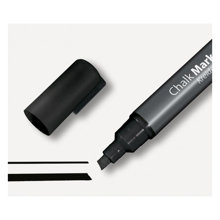 Ľahko stierateľné a vysoko nepriehľadné kriedové popisovače vhodné na sklenené tabule a všetky hladké povrchy podobné sklu. Zrezaný hrot hrúbky 1 - 5 mm. Vodeodolný atrament je zmazateľný vlhkou alebo suchou utierkou. Farba čierna.
