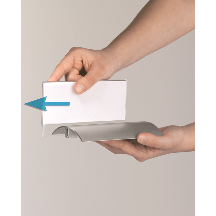 Štýlová stolová menovka s hliníkovým podstavcom. Unikátny uchytávací systém zabraňuje samovoľnému alebo neželanému vysunutiu menovky.Čítanie z oboch strán. Ideálna na konferencie, porady alebo miesta na styk so zákazníkom. Balenie 2 ks.