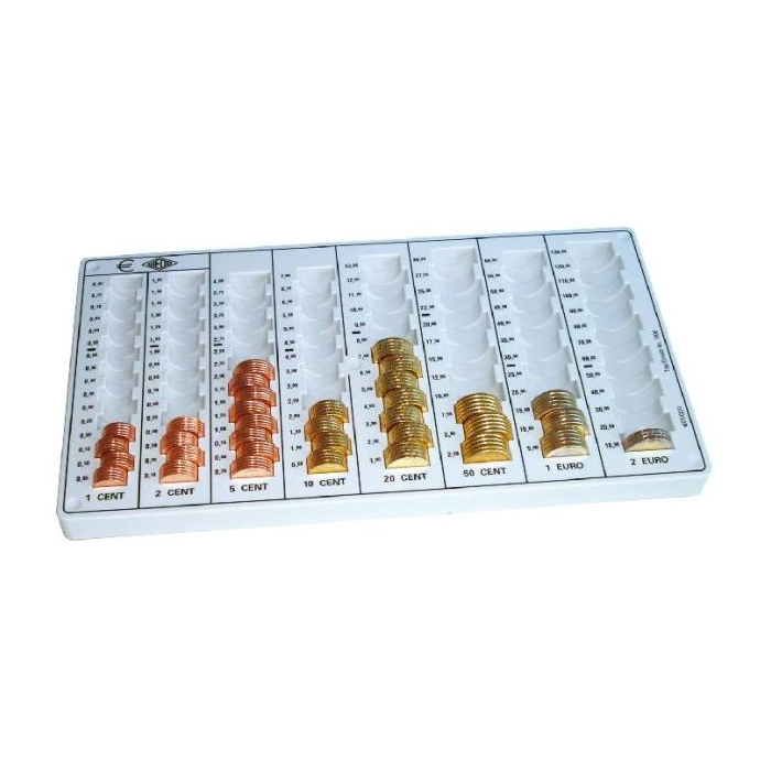 Samostatná mincová priehradka z plastu. Zo spodnej strany zabezpečená proti kĺzaniu štyrmi gumovými nožičkami. Rozmerovo vhodná do bežnej stolovej zásuvky. Maximálna kapacita obnosu 246,40 Euro.