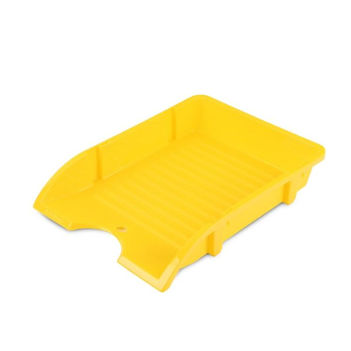 odkladač na stôl s novým originálnym štýlom vyrobené z nerozbitného a deformačne odolného polypropylénu rebrovaný povrch na dne odkladača možnosť vertikálneho spojenia odkladačov a ich umiestnenia na seba pre zníženie objemu počas prepravy otvor v základni a výrezy po stranách pre jednoduché použitie formát: A4 rozmery: 250x345x45mm farba: žltá