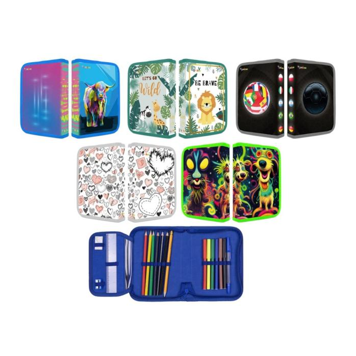 Kvalitné 2-klopé peračníky s príslušenstvom, 32 dielov. Dodávané v mixe motívov. Rozmery 19,5 x 13,5 x 3,2 cm. Balenie 10 ks. Farba mix.