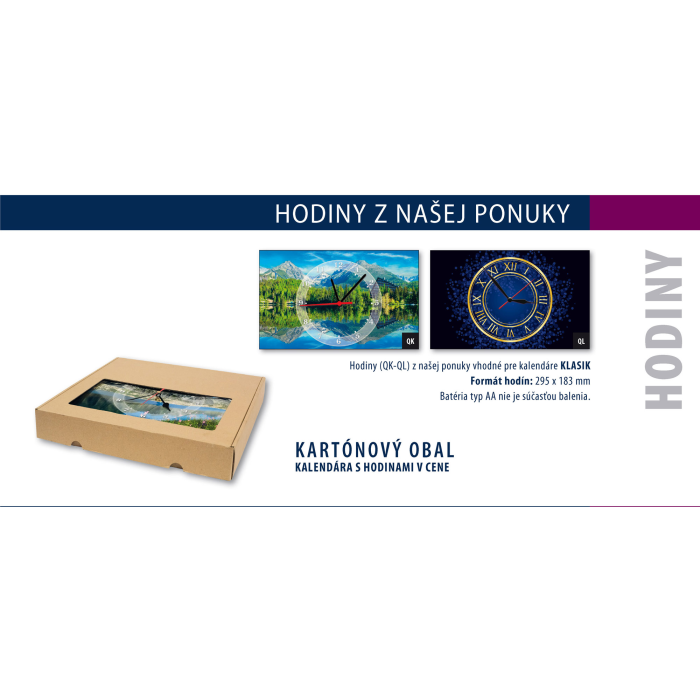Rozmery: 295 x 925 mm. ROZSAH: 3 x 12 listov. KALENDÁRIUM: 3-mesačné s menami SK, názvy mesiacov a dní v SK. VÄZBA: 1x šitá s perforáciou, 2x špirála. REKLAMNÁ POTLAČ: 2 x 295 x 30 mm, 295 x 60 mm. BALENIE: 20 ks.S hodinami QL.
