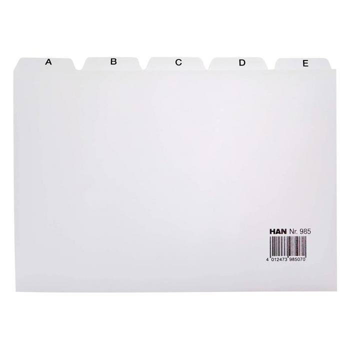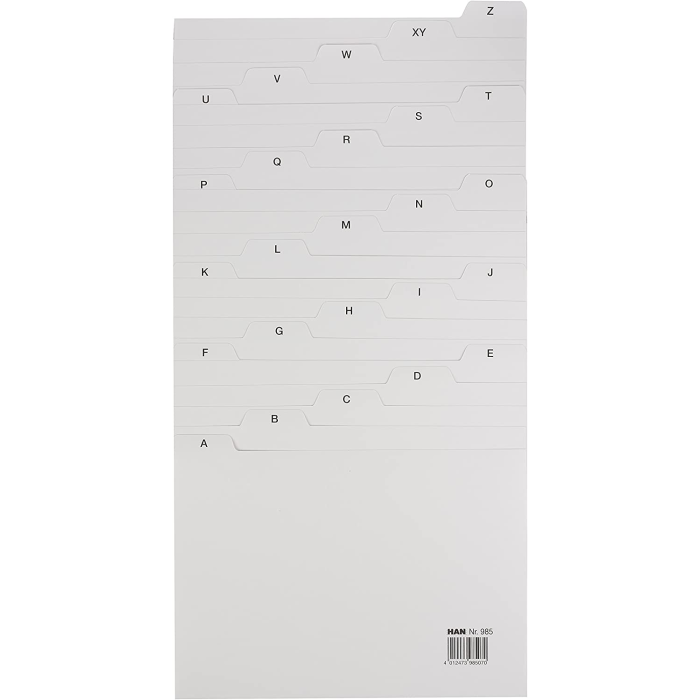 Indexové kartičky A-Z pre stolové kartotéky HAN. Farba sivá. Formát : A5 Farba: sivá Balenie: 25 ks Veľkosť (ŠxVxH)210 x 158 x 1 mm Šírka hlavy záložky: 41 mm