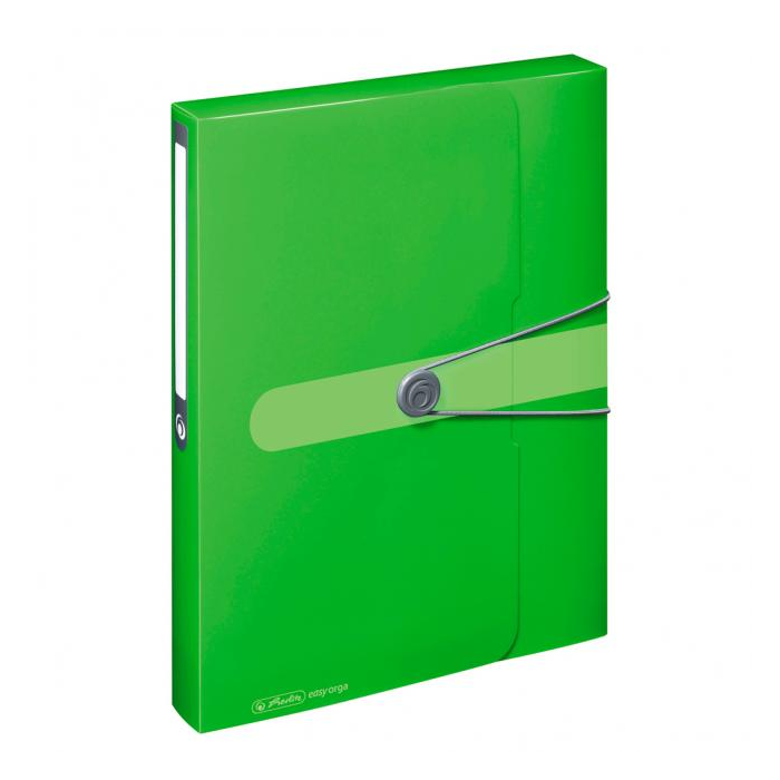 Box z polypropylénu Easy Orga na dokumenty formátu A4. Kapacita 400 listov, šírka chrbta 4 cm. Zatváranie sivou gumičkou o sivý plastový krúžok, nalepený chrbtový štítok na popis obsahu. Väčšie balenie 10 ks. Farba zelená.