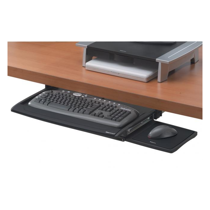 Polica vybavená sklápacou podložkou pod myš s možnosťou jej upevnenia sprava alebo zľava a opierkou zápästia. Inštalácia police v troch rôznych výškach pod stolovú dosku: 44, 54 alebo 64 mm. Farba antracitová/ strieborná metalíza.
