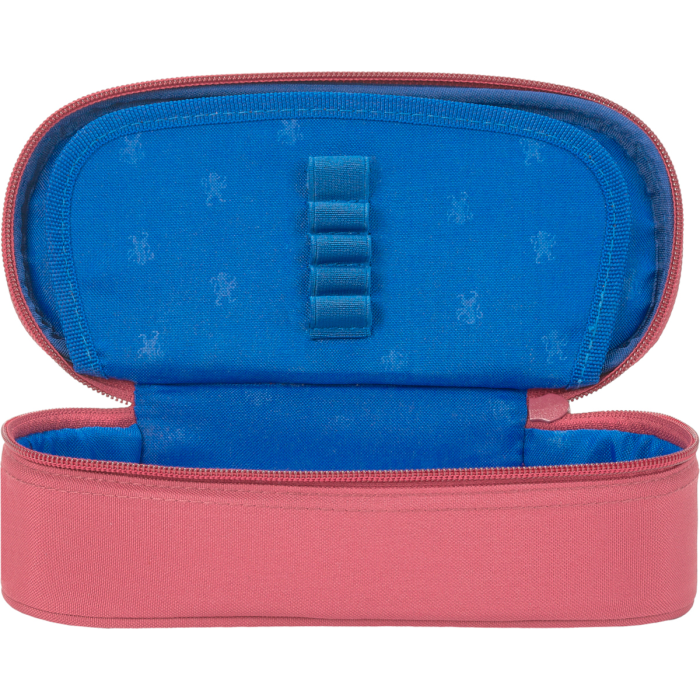 Vodeodolná polyesterová tkanina, tmavo modrá podšívka s vyrazeným vzorom leva. Klopa s integrovaným vreckom a pútkami na pero. Hlavné vrecko na zips. Rozmery 23,5 x 8,5 x 5 cm.