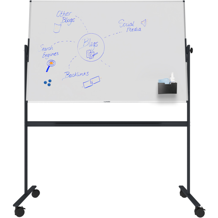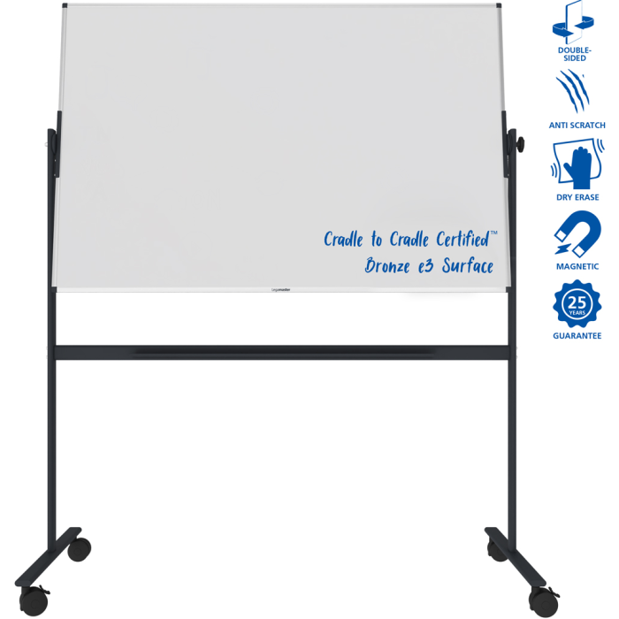 Magnetická tabuľa odolná voči poškriabaniu so smaltovaným oceľovým povrchom s použitím e3 Ceramic Steel, ktorá má certifikáciu Cradle to Cradle Certified™ na úrovni bronzu. Upevnená na robustnom a mobilnom stojane s otočnou osou 360° a 4 kolieskami (2 uzamykateľné). Súčasťou balenia je odkladacia lišta. Rozmery: 100 × 150 cm.