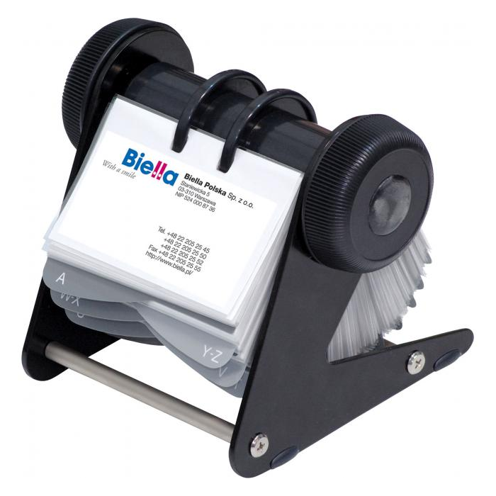 Praktický rotačný vizitkár s kovovou podstavou v čiernej farbe obsahuje 200 obojstranných vreciek rozmerov 103×66 mm na 400 vizitiek a abecedný rozraďovač s 2 oddielmi.