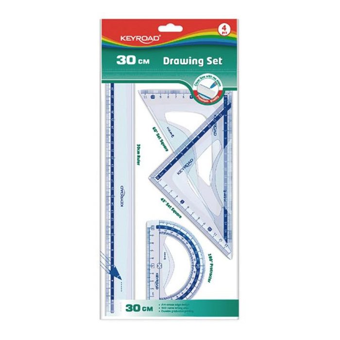 Sada geometrických pomôcok užitočná pre každého študenta. Ohybná, s mierkou podľa noriem. Sada: pravítko 30 cm, uhlomer 10 cm, 2 x trojuholník 13 a 19 cm. Farba: transparentná.