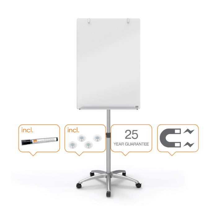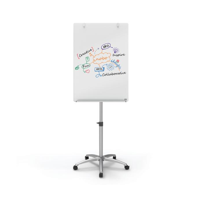 Na sklenený flipchart Nobo sa vojdú všetky vaše nápady! Štýlový moderný dizajn a výškovo nastaviteľná základňa na kolieskach sa hodí do každej zasadacej miestnosti a kancelárie. Obsahuje háčiky na zavesenie flipchart blokov. Magnetický sklenený povrch zaručuje najlepšiu možnú mazateľnosť a je vhodný na každodenné používanie. Rozmery 70 x 100 cm.