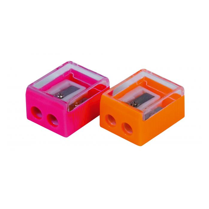 Dvojité plastové strúhadlo so zásobníkom na štandardné a farebné ceruzky. Dodávané v mixe farieb bez možnosti výberu konkrétnej farby. Väčšie balenie 40 ks.