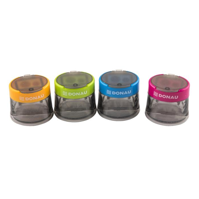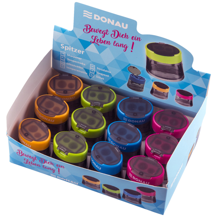 Strúhadlo dvojité s viečkom DONAU transparentné pre pravákov, mix farieb, display 12 ks