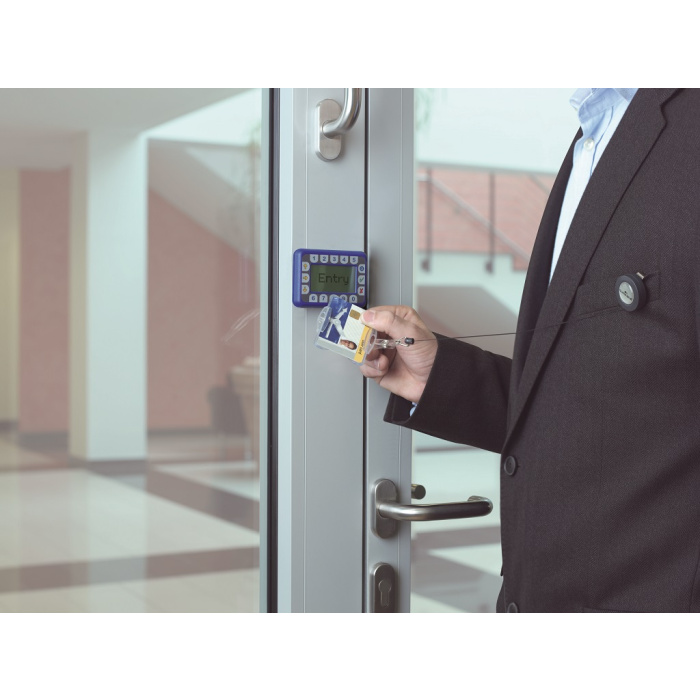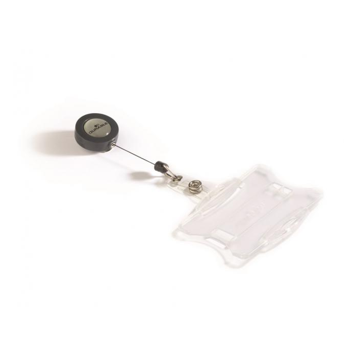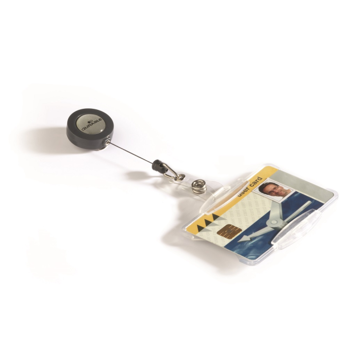 Plastová visačka na jednu plastovú identifikačnú kartu z priehľadného pružného plastu vysokej kvality, z prednej strany otvorená. Vhodná na ochranu magnetických a bezpečnostných kariet pred poškodením. Uchytenie klipu na kratšej alebo dlhšej strane poskytuje univerzalitu pri použití horizontálne alebo vertikálne označených kariet. Výsuvný kotúčik čiernej farby s kovovým klipom s možnosťou vysunutia do 80 cm. Balenie 10 ks. Rozmery š × v: 85 x 54 mm