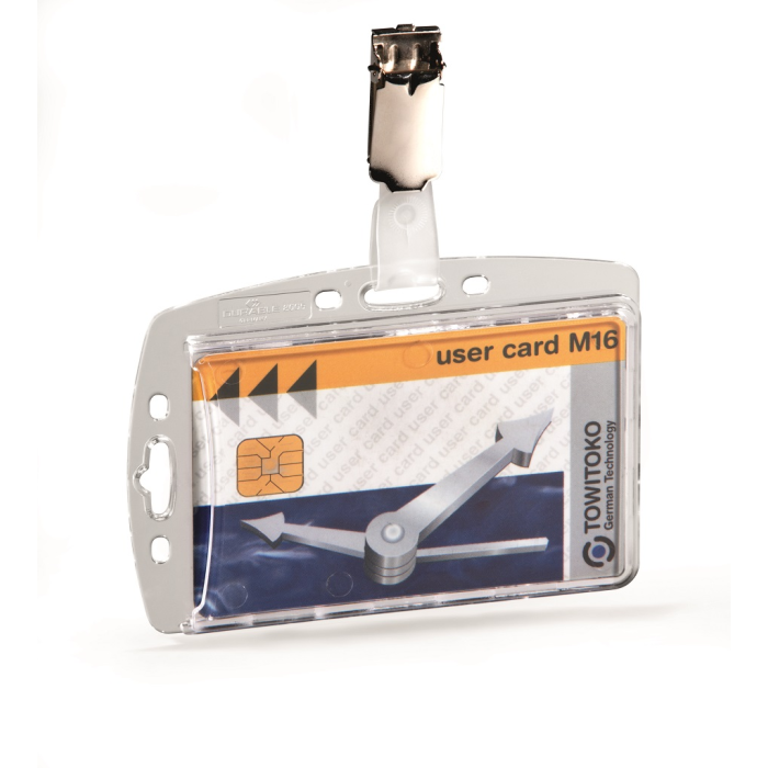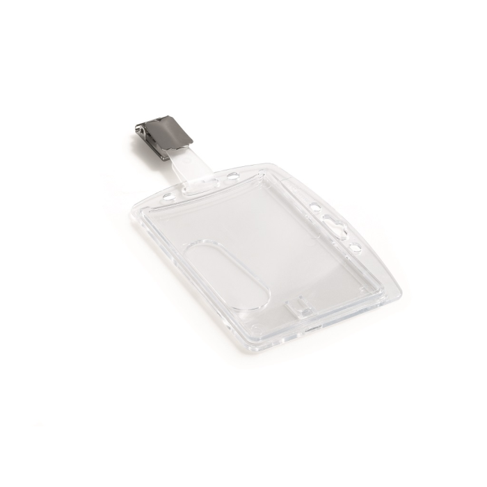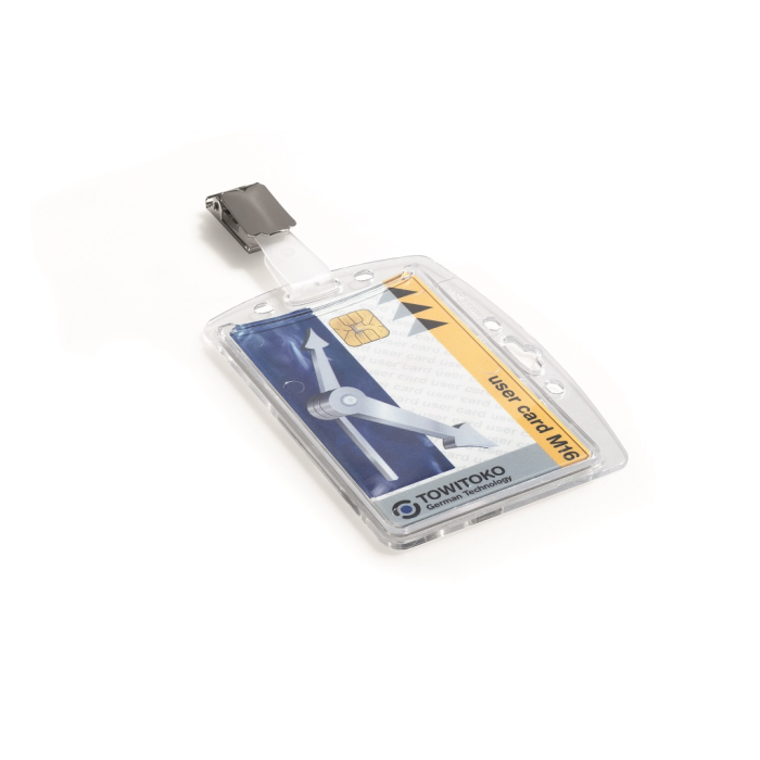 Visačka na jednu plastovú identifikačnú kartu z priehľadného plastu, ktorý chráni kartu pred poškodením. S otvorom na palec na rýchle a jednoduché vysunutie karty. Visačka z plastu, kovový štipec na uchytenie napr. k vrecku. Balenie 25 ks.