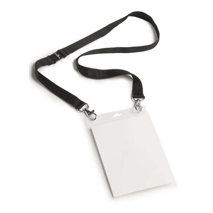 Visačka z PP s perforáciou na uchytenie a textilným remienkom šírky 20 mm s 2 karabínkami. Ideálna na vybavenie väčšieho počtu osôb na konferenciách, výstavách a pod. Dodávaná s etiketou formátu A6. Remienok čierny.