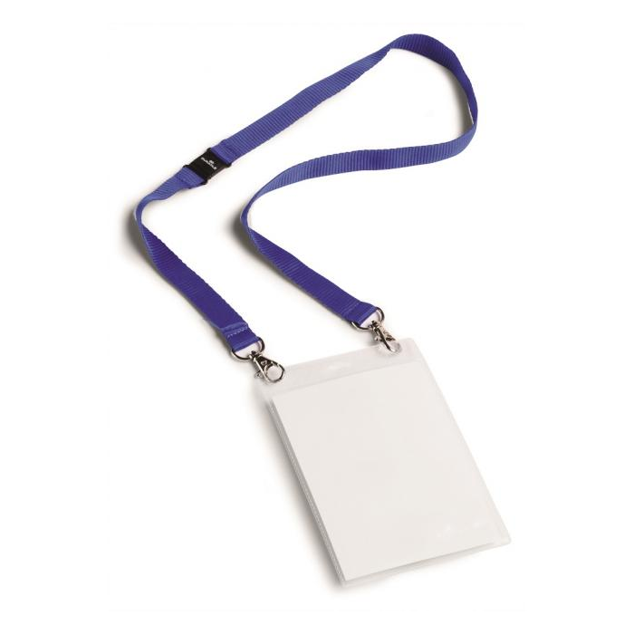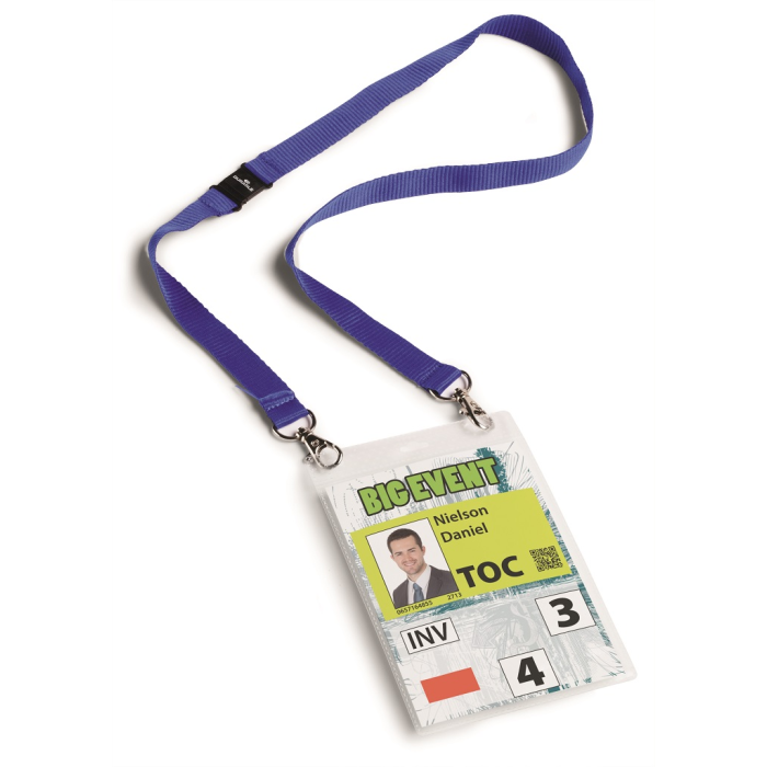 Visačka s remienkom Visačka z PP s perforáciou na uchytenie a textilným remienkom šírky 20 mm s 2 karabínkami. Ideálna na vybavenie väčšieho počtu osôb na konferenciách, výstavách a pod. Dodávaná s etiketou formátu A6. Remienok modrý.