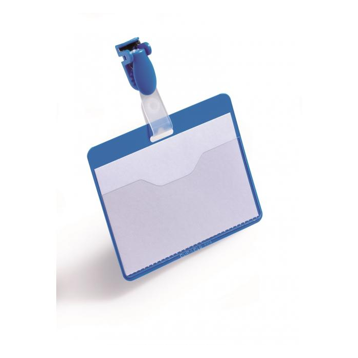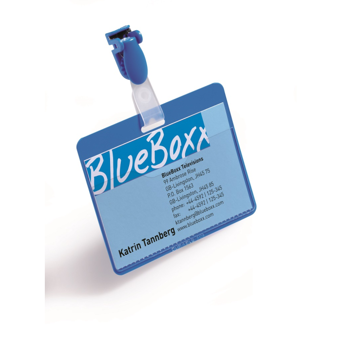 Priehľadná visačka s európskym štipcom, umiestneným na dlhšej strane visačky. Dodávané s papierovými kartičkami rozmerov 90 × 60 mm. Model, pri ktorom možno menovku vyberať bez potreby odnímania štipca s remienkom. Farba modrá. Balenie 25 ks.
