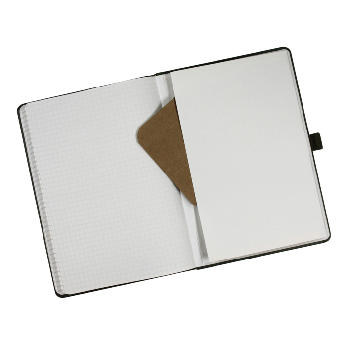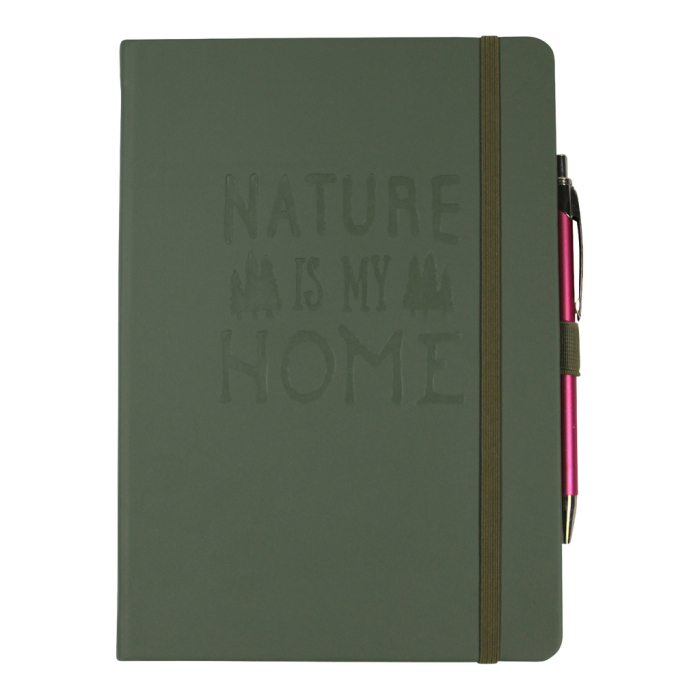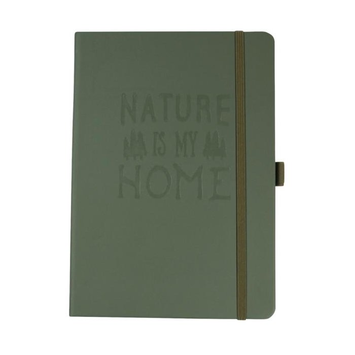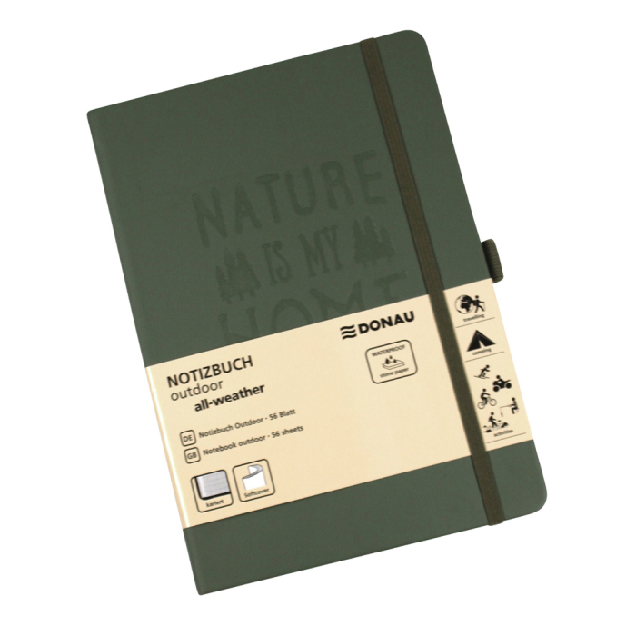 Zápisník outdoorový A5, štvorčekový. Vodoodolný obal s dizajnovým razením, 56 listov vodoodpudivého papiera, 120 g/m². S pútkom na pero, gumičkou a archívnym vreckom. Farba olivová.