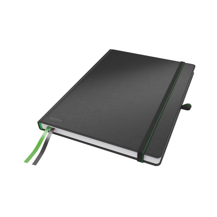Zápisník s uzatváraním na gumičku s úchytom na pero a 2 textilnými záložkami. Posledných 8 strán perforovaných, samolepiace záložky na zadnej strane na označenie dôležitého obsahu, vnútorný obal s rozšíriteľnou kapacitou na prednej a zadnej strane na uloženie voľných listov. Materiál kožený vzhľad (syntetická koža). Úprava štvorčeková. Počet listov 80. Formát A4. Farba čierna.