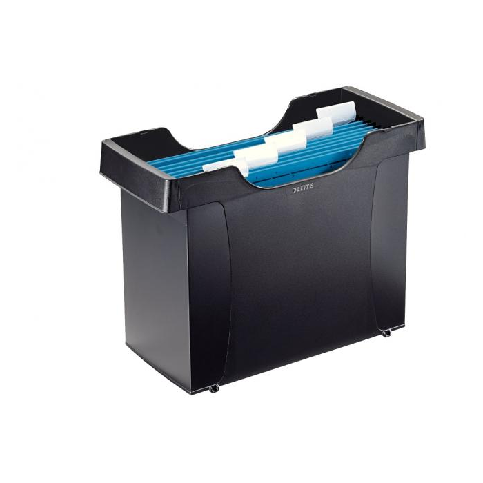 Zásobník na 20 štandardných závesných obalov formátu A4 s predným výrezom a postrannými skrytými držadlami na prenos. Dodávaný s 5 závesnými obalmi Leitz Alpha. Vnútorné rozmery 370 × 260 × 162 mm.