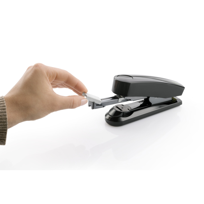 Stolová zošívačka s veľkou kapacitou súčasne zošitých listov so systémom plochého zošívania (Flat-Clinch), umožňujúca superľahké zošívanie a z kolekcie šetrnej k životnému prostrediu re+new, s lesklým plášťom z 80% recyklovaného plastu. Kovový zásobník s dvojitým vedením spiniek. Kapacita náplne 100 spiniek 24 / 6 - 8 alebo 150 spiniek 26 / 6 - 8. Hĺbka zošívania 6 cm. Hmotnosť 265 g. Záruka 25 rokov. Súčasťou balenia je 200 spiniek 24 / 6 DIN SUPER. Kapacita 50 listov. Farba čierna.